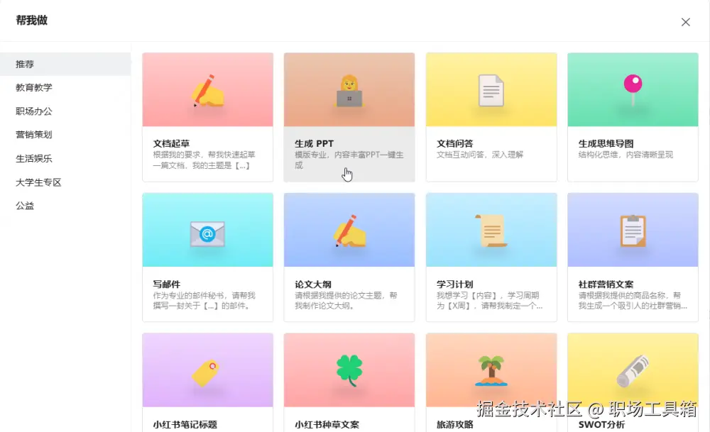 腾讯文档 - AI 文档助手是一款由 AI 驱动的工具,能够一键生成高质量 PPT。它支持两种生成方式,一是通过输入主题生成 PPT,二是选择已有材料生成 PPT。用户可以根据自己的需求选择合适的方法,智能助手会根据提供的信息自动生成 PPT。