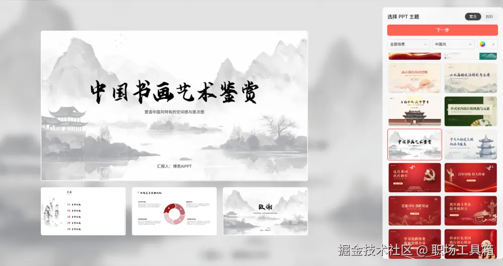 编辑好大纲后,点击下方的按钮进入PPT模板库。博思AIPPT预置了上百款高品质的PPT模板,你可以从模板场景、设计风格、主题颜色 3 个维度来组合筛选模板。例如,如果你需要制作一份商务汇报 PPT,可以选择商务科技风格的模板;如果是文化活动展示,可以选择文艺清新风格的模板。