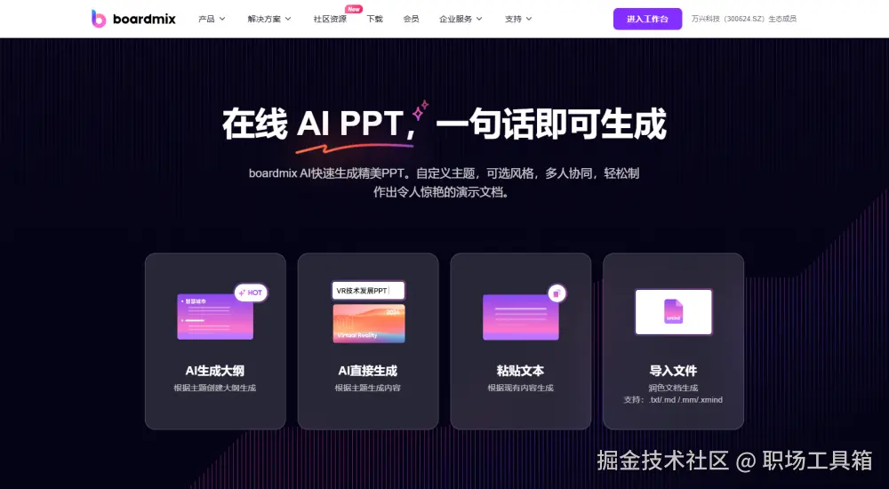 boardmix AIPPT团队协作功能强大,支持多人同时编辑白板和 PPT,促进团队创意碰撞,提高工作效率。它采用先进的机器学习算法,能够理解用户的创意脉络,并将其转化为结构化的演示文稿。