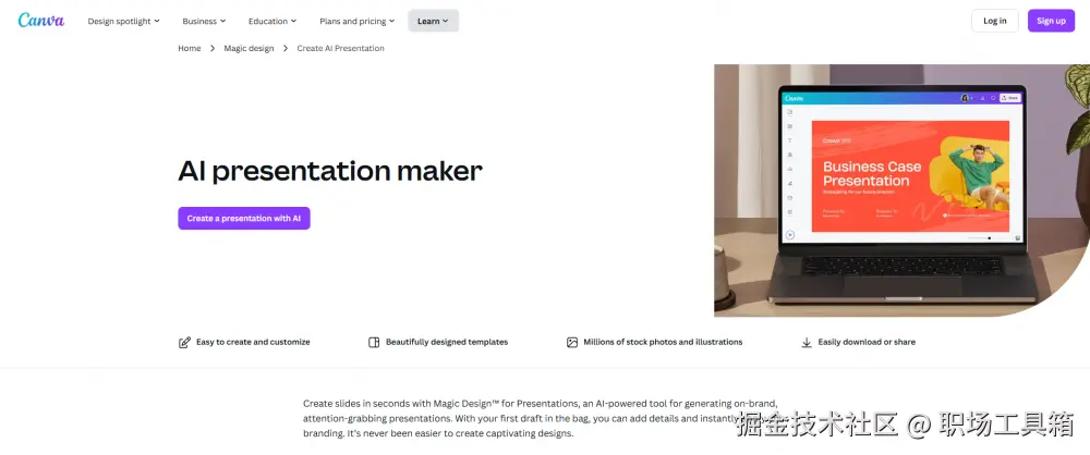 CanvaPPT创意元素丰富,为用户提供了数以千计的专业设计模板,涵盖各种主题和风格。用户可以根据自己的需求进行自定义修改,设计自由度高。