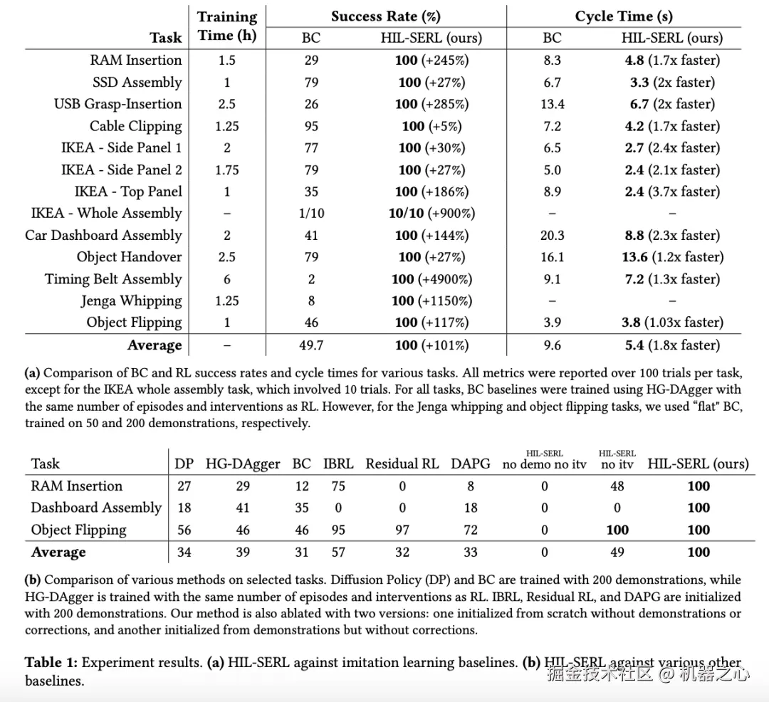 使用同样数量的人类数据(演示和校正的数量)时,他们训练的策略远胜过模仿学习方法 —— 成功率平均超过 101%,周期时间平均快 1.8 倍。
