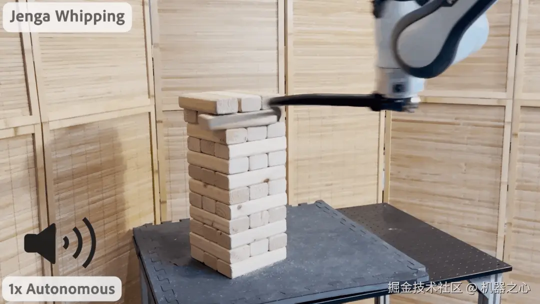 下面展示了一个超越人类水平的有趣示例:用一根鞭子将一块积木抽打出去,同时保证积木塔整体稳定。很显然,这个任务对大多数人来说都非常困难,但这台机器人通过强化学习掌握了这一技能。
