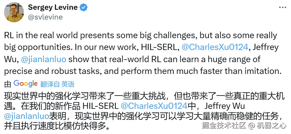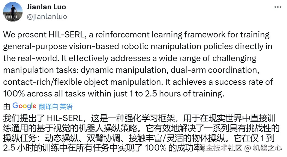 论文一作 Jianlan Luo 的推文,他目前正在 UC 伯克利 BAIR 实验室从事博士后研究