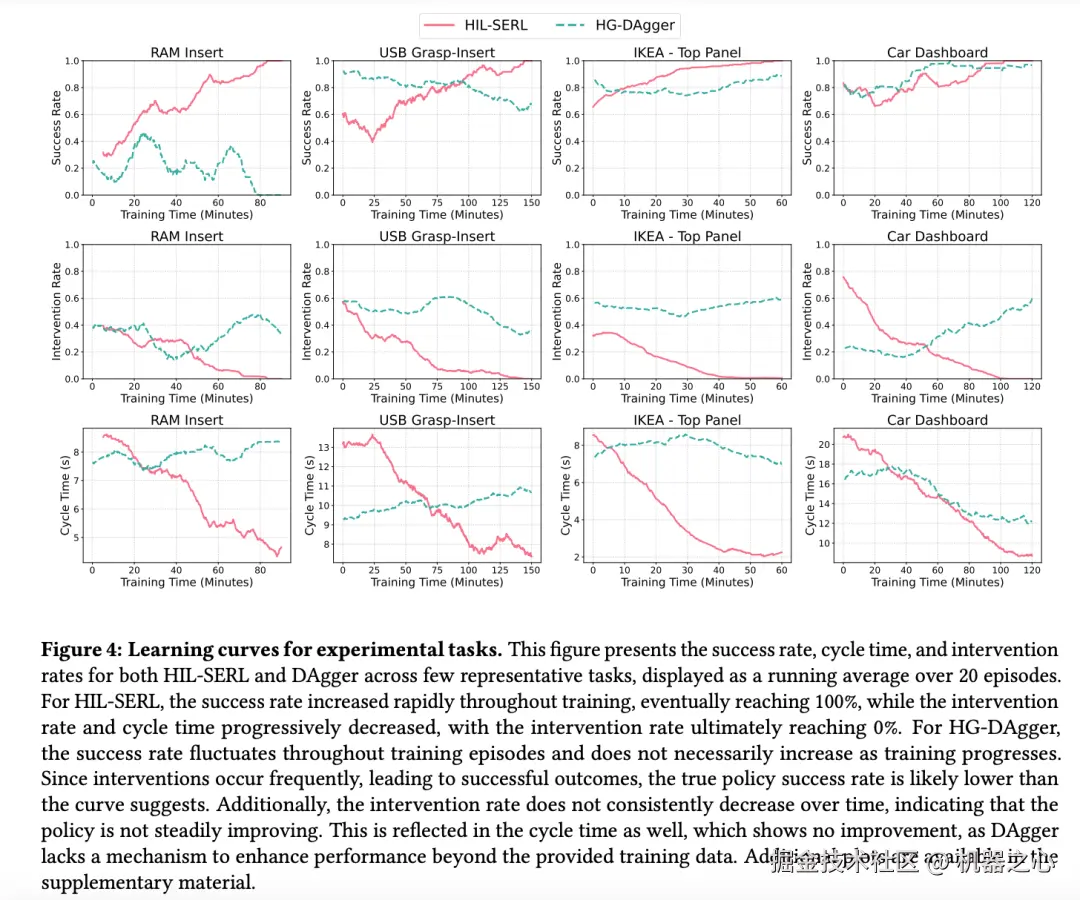 同时,人工干预的总时长也大幅度减少。策略不成熟时,机械臂犯错,需要花较长时间纠正,随着 HIL-SERL 不断完善,较短的干预就足以减少错误。相比之下,HG-DAgger 需要更频繁的干预,亦不会因为策略逐渐完善减少犯错的次数。