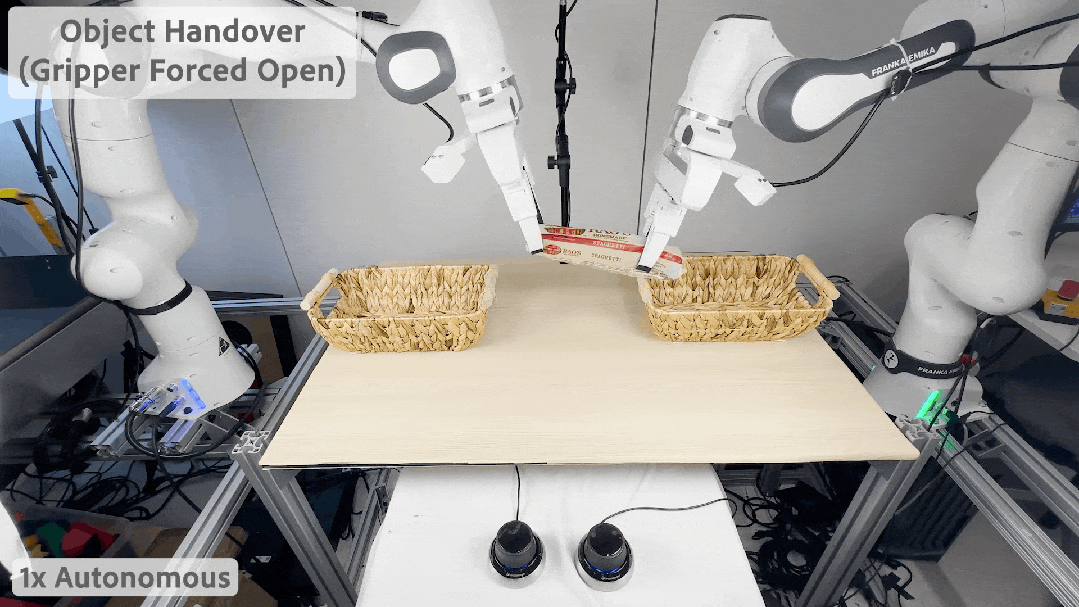 在两个机械臂对接时,研究人员有意让其中一个机械臂「失误」,放开了手中的物体。在 HIL-SERL 的加持下,两个机械臂自主分工合作,又恢复了搬运物体的平衡。