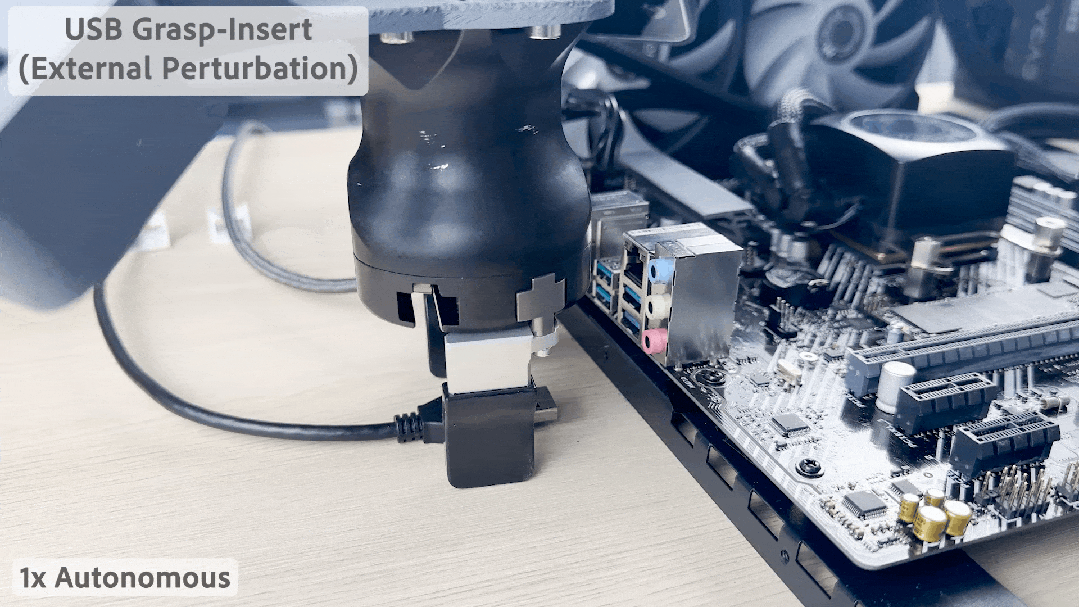 对于没有独立思考能力的机器人来说,任务执行起来那是相当死板。一旦目标物体换了一个位置,它们就会迷失方向。但对于采取 HIL-SERL 框架的机器人,就算你强行夺走它手中这根 USB 线,它依然能自动定位,重新完成任务。