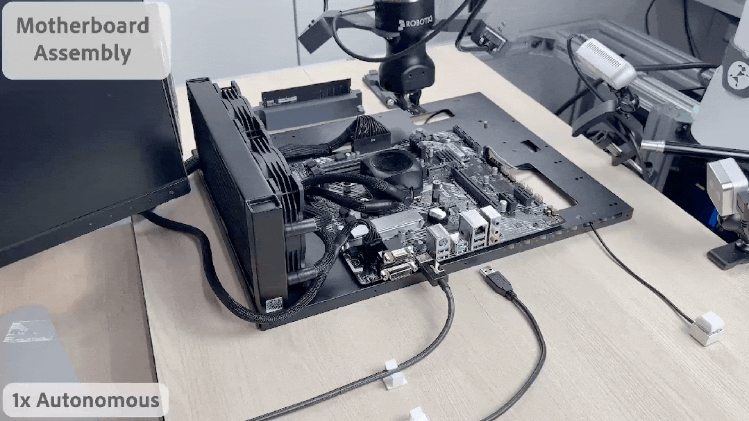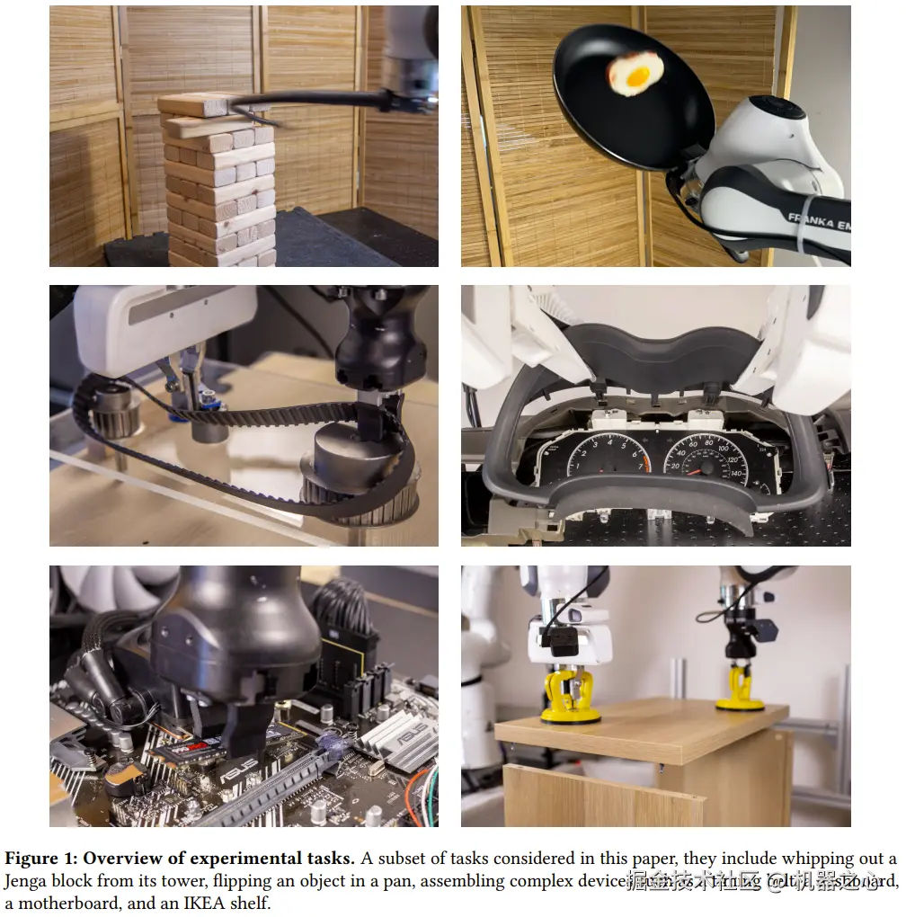 如图 1 所示,该系统可解决的任务纷繁多样,包括动态翻转平底锅中的物体、从积木塔中抽出一块积木、在两个机器臂之间递交物体以及使用一个或两个机械臂组装复杂的设备,例如计算机主板、宜家置物架、汽车仪表板或正时皮带。