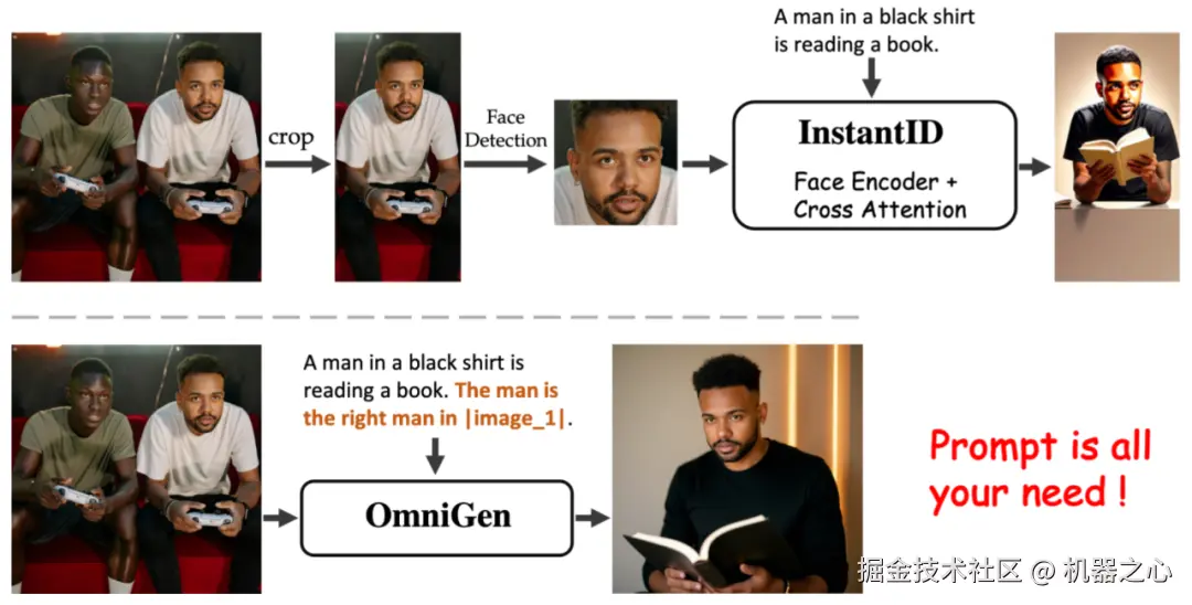 而诸如 InstandID 等方法还需使用额外的人脸检测器提取面部信息,并用面部编码器提取特征以输入模型。
