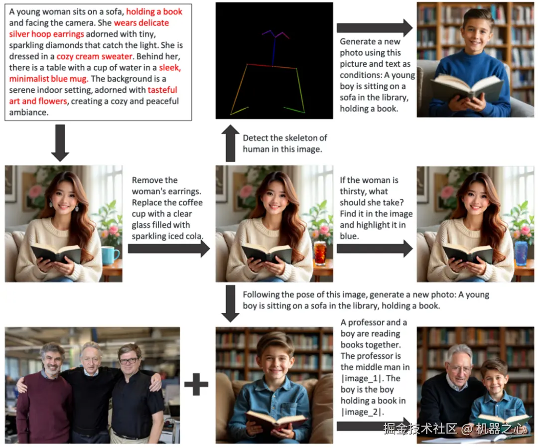 基于 OmniGen 的通用能力,可实施更灵活的图像生成,以上展示一个简单 Pipeline:文本生成图像,编辑生成图像的部分元素,根据生成图像的人体姿态生成重绘图像,从另一图像中提取所需对象与新图像融合。