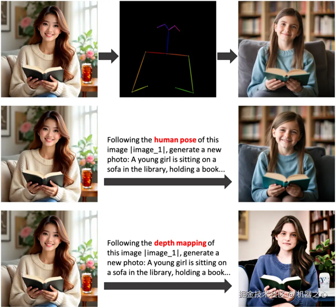同时,OmniGen 还能更进一步简化中间流程,一步出图:直接输入原图,输入指令「Following the human pose (or depth mapping) of this image, generate a new image:...」,就可根据输入图像的人体姿态或深度图关系生成新图像。