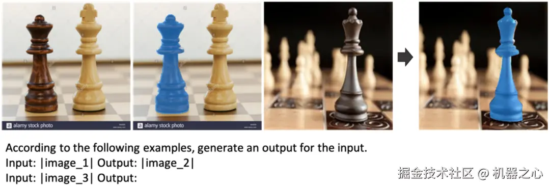 另一方面,OmniGen 具有一定程度的上下文学习能力,可根据参考样例对图像进行处理。例如,输入一个分割皇后象棋的输入 - 输出配对样例 (Example),模型能识别并分割新输入图像中对应的物体: