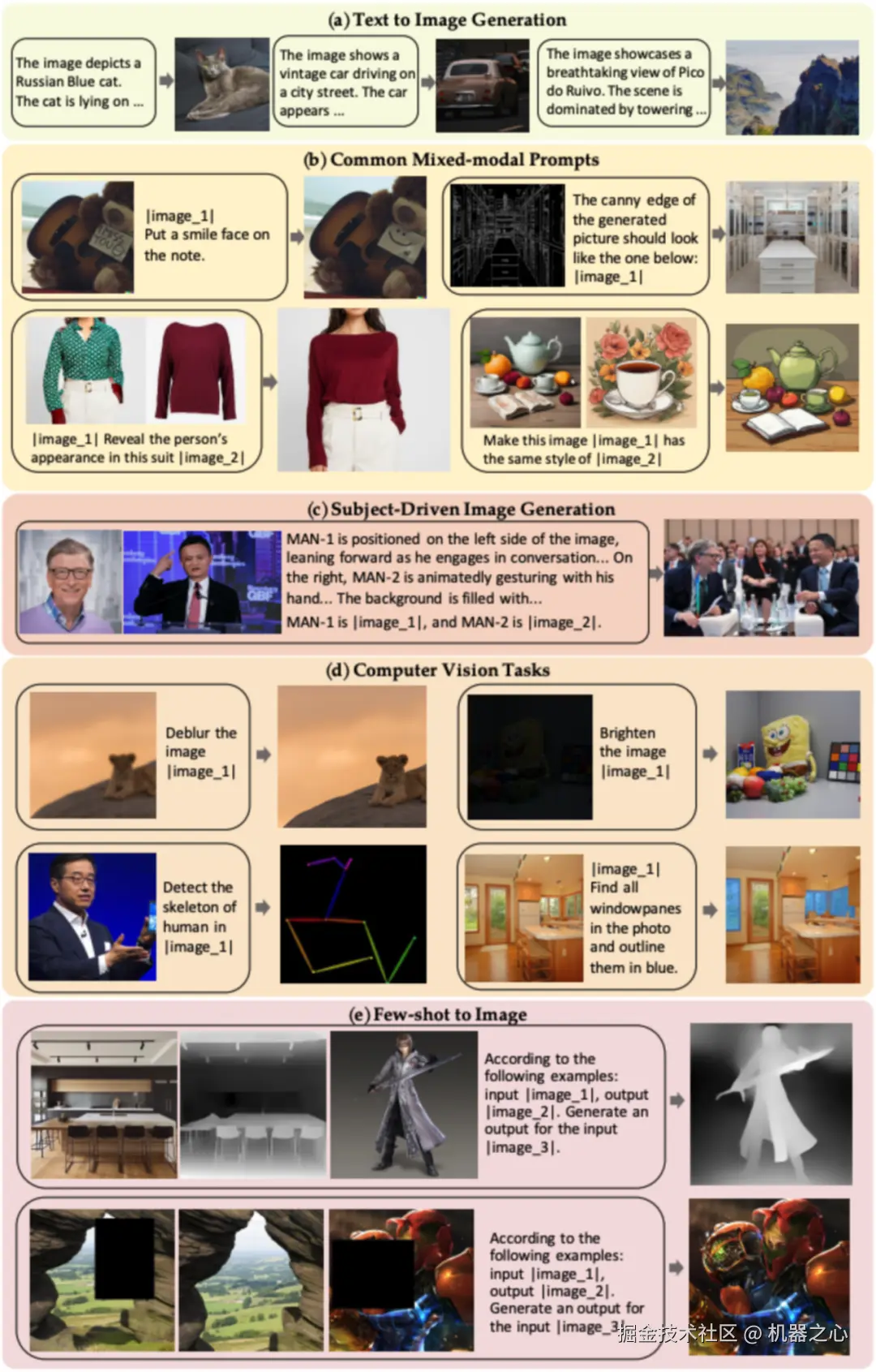 相反,在文本生成领域,以 ChatGPT 为代表的模型可通过人类指令直接处理各种文本任务。那么,在图像生成领域,能否通过单个支持多种输入且耦合多项能力的模型,基于用户指令完成各种生成任务,而无需各种繁杂的流程吗?