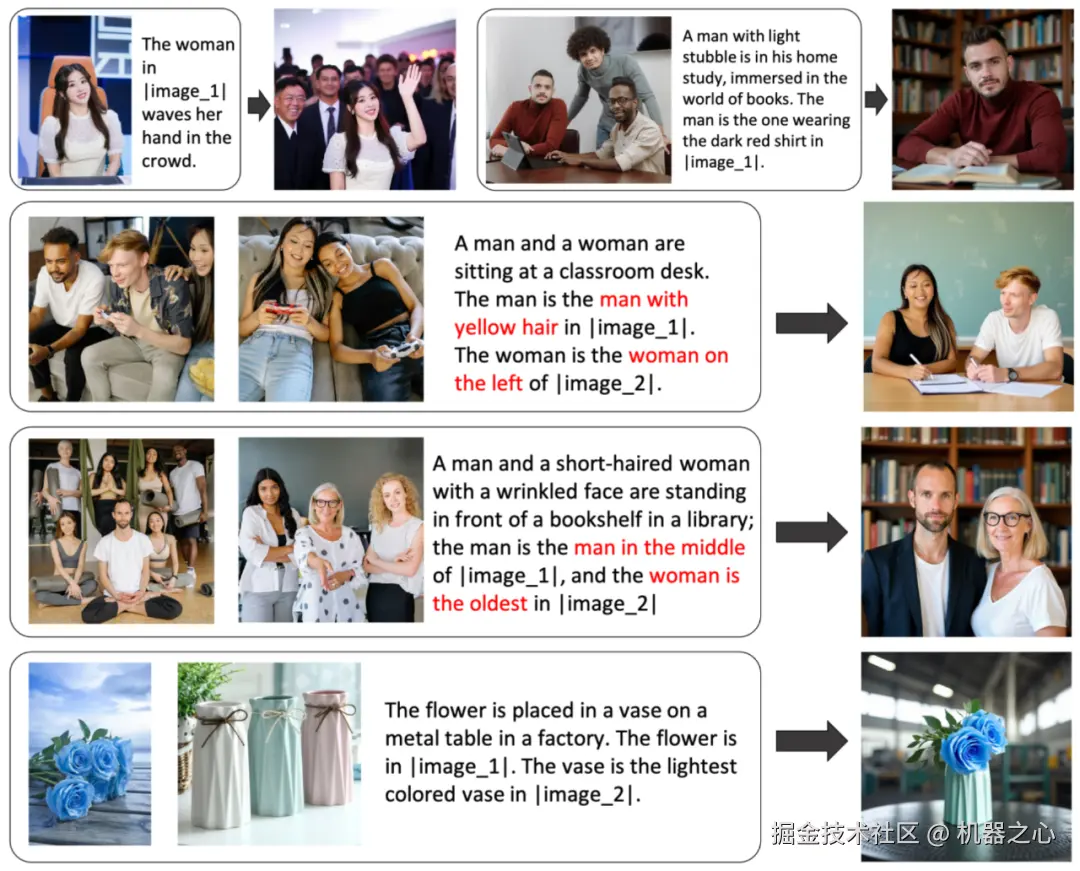 值得注意的是,各种不同的生成任务甚至还需更多不同的插件和操作,如此复杂、琐碎而冗长的工作流极大地增加了训练和应用的成本。然而,即便如此繁琐,有时也仍难以满足一般的图像生成的需求,例如基于指定多张照片中的实体生成新图像。