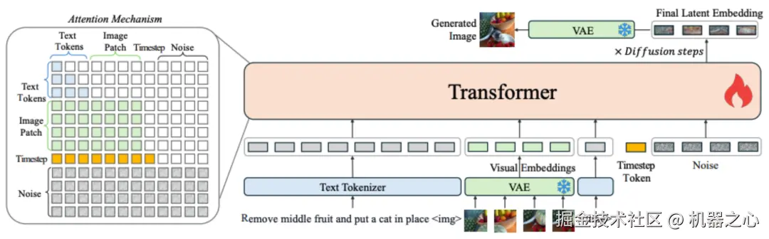 OmniGen 的核心设计原则是:简洁和有效。因此,我们最大程度舍弃了各种额外模块。OmniGen 的基本架构为:一个 Transformer 模型和一个 VAE 模块,共 3.8B 参数。其中,Transformer 继承于 Phi3-mini 模型,图像内部改用双向注意力 (Bidirectional Attention) 以契合图像数据特性。整体架构如下所示:
