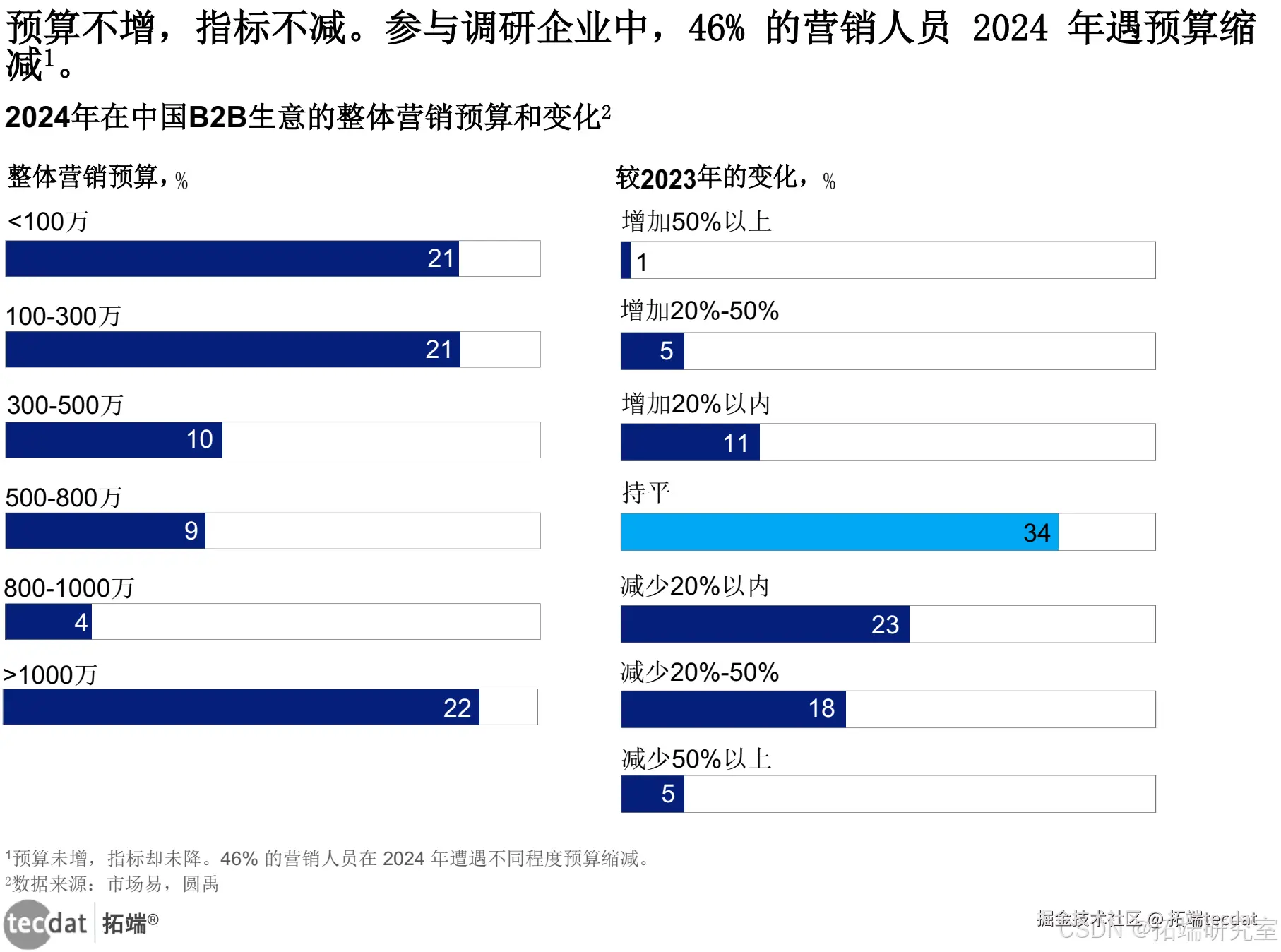 2024 年,46% 参与调研企业的营销人员预算缩减,预算不增指标不降。marketer 见面常问预算及出差,此情况较普遍。