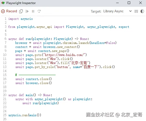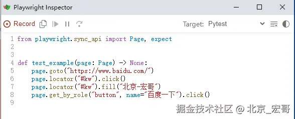 如果您想在某些非标准设置中使用 codegen(例如,使用browser_context.route()),可以调用page.pause(),这将打开一个带有 codegen 控件的单独窗口。这个相比大家在宏哥之前注释的代码里看到过,主要是用来调试代码的。