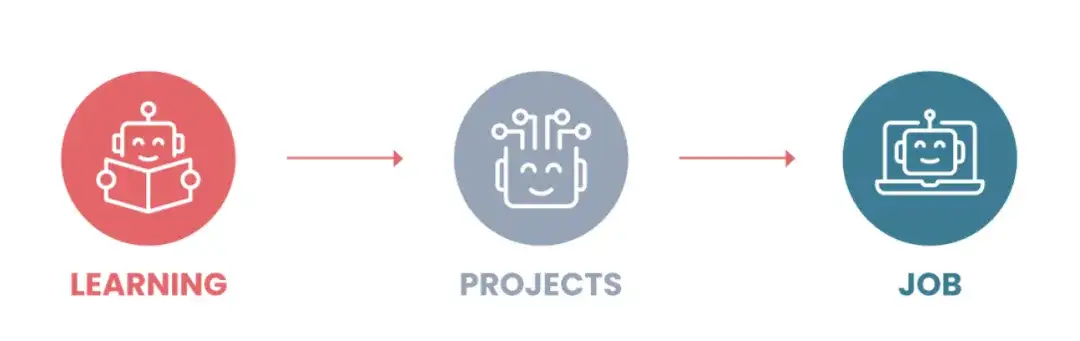 吴恩达表示:职业发展的三个关键步骤是学习基础技能、做项目(提升你的技能,建立作品集并产生影响)以及找工作。这些步骤相互叠加。然后为我们绘制了职业路线图: