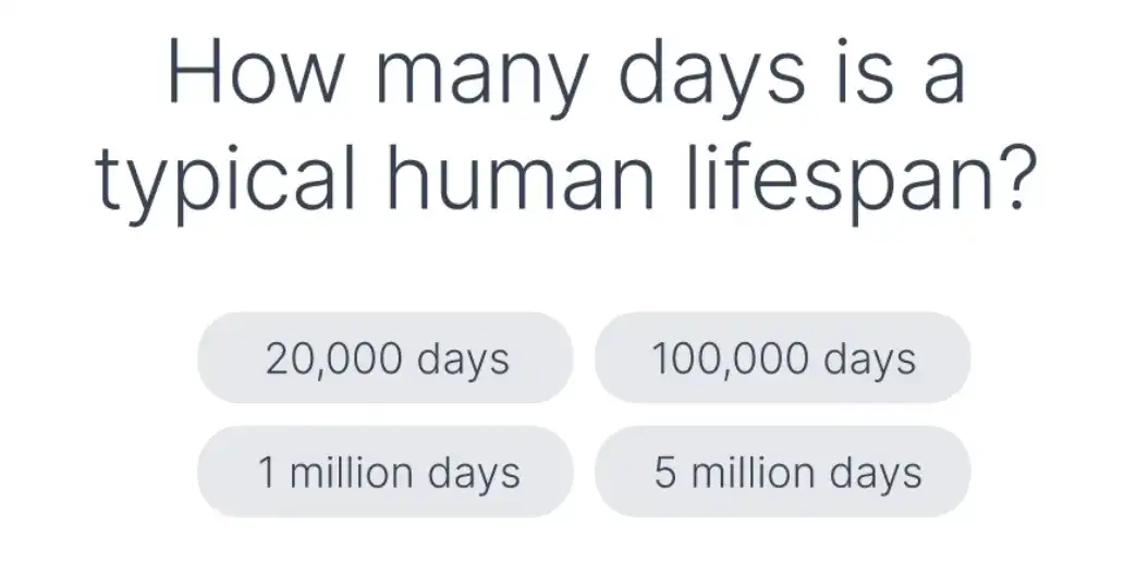 当我问朋友们时,很多人选择了几十万。(其他人则会计算出答案,让我很恼火!)当我还是研究生的时候,我记得我把我的统计数据输入到一个死亡计算器里来计算我的预期寿命。这个计算器告诉我我可以活27649天。我觉得这个数字好小啊。我把它用大字体打印出来贴在我办公室的墙上作为每天的提醒。这是我们可以与亲人共度、学习、为未来做准备并帮助他人的时间。无论你在做什么,今天所做的事情值得你生命中的三分之一吗?