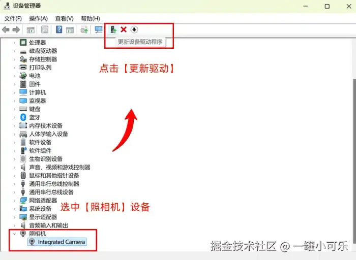 电脑摄像头在哪里安装?如果电脑摄像头驱动尚未更新,我们可以在设备管理中更新设备驱动,即可使用电脑摄像头。具体的确认步骤是,打开【设备管理器】,找到并选中【照相机】设备,然后点击界面上方的【更新驱动】的标志即可。