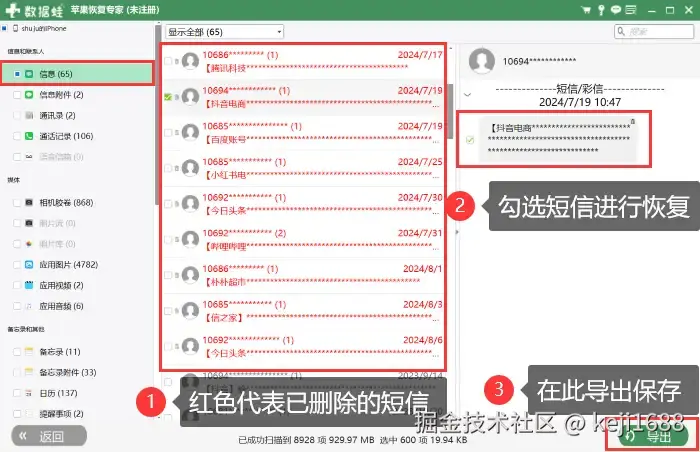 步骤2:软件会为您进行加密且深度的扫描,最大可能地为您找到可以恢复的信息。扫描结束后,在【信息】选项中勾选您需要的短信进行恢复并导出保存即可。