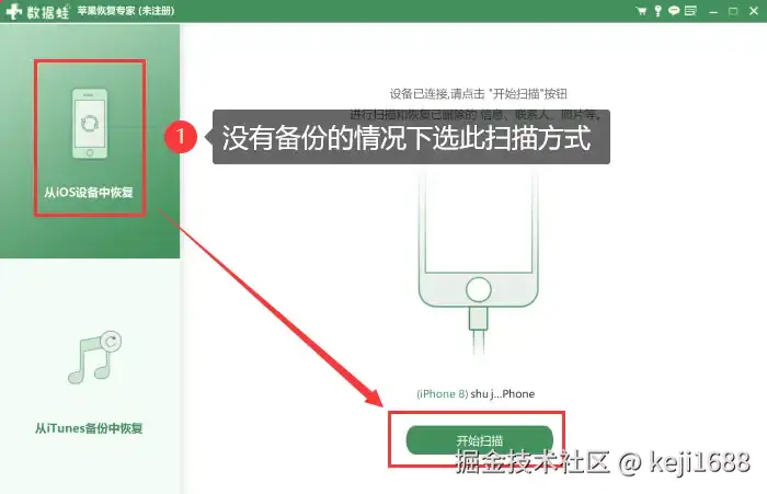 步骤1:将苹果手机通过数据线连接电脑,启动苹果恢复专家并选择信任电脑设备,选择合适的扫描方式扫描手机。