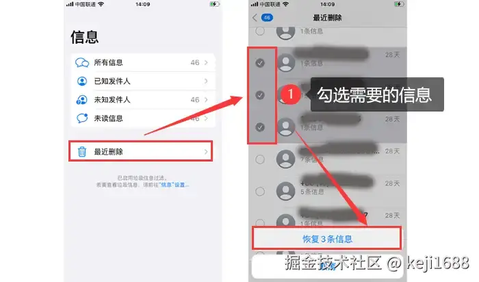 恢复方法:只需在手机的信息应用中,找到并点击进入【最近删除】文件夹,找到需要的信息进行恢复即可。但请注意,该功能有一定的时间限制,超过设定的保留期限后,短信将被永久删除,因此请尽快行动。