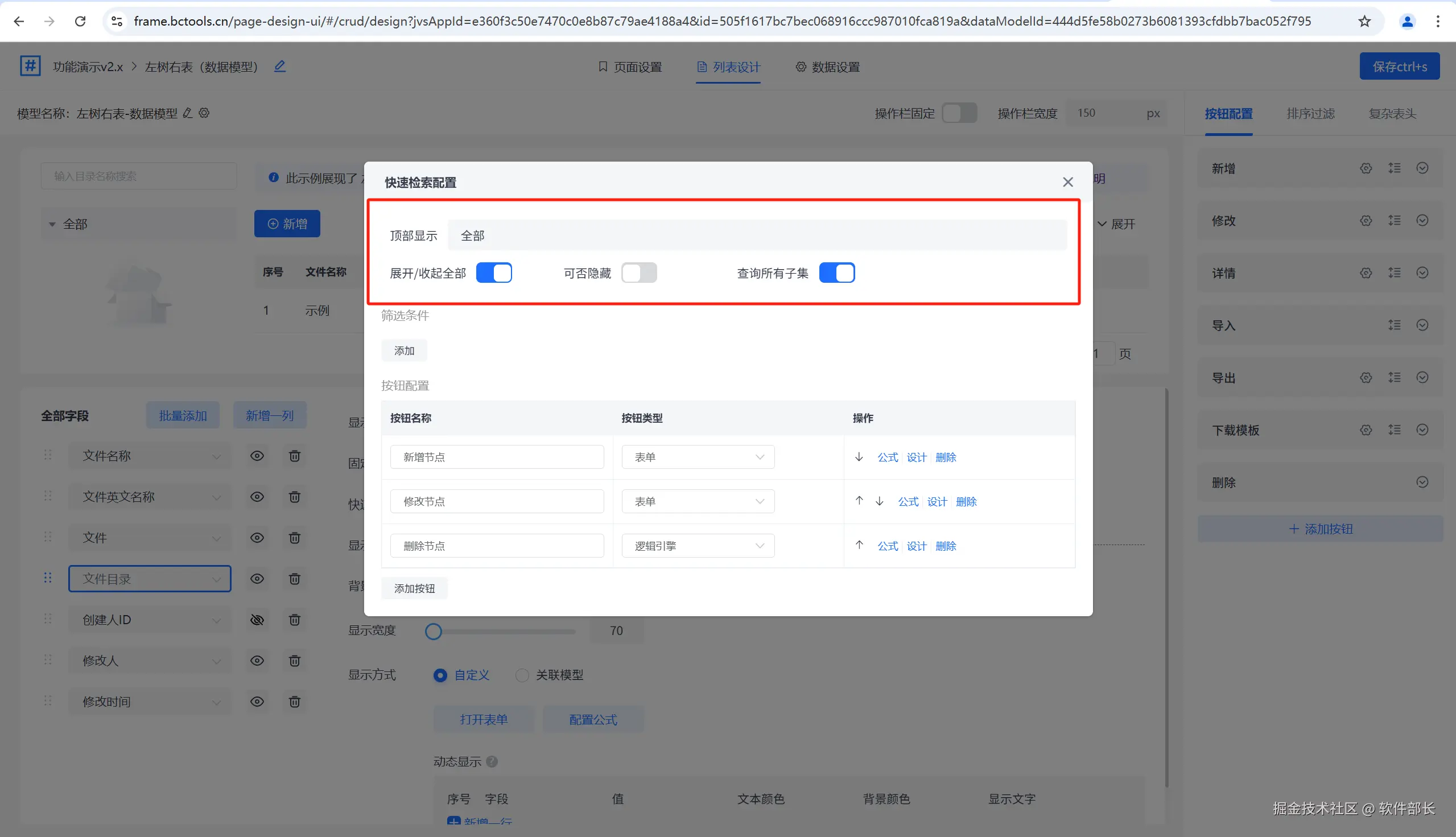 1、左树右表中,增加更多详细操作的配置,全部内容的展示信息、隐藏配置、查询所有子集的配置开关、可以配置查询条件等