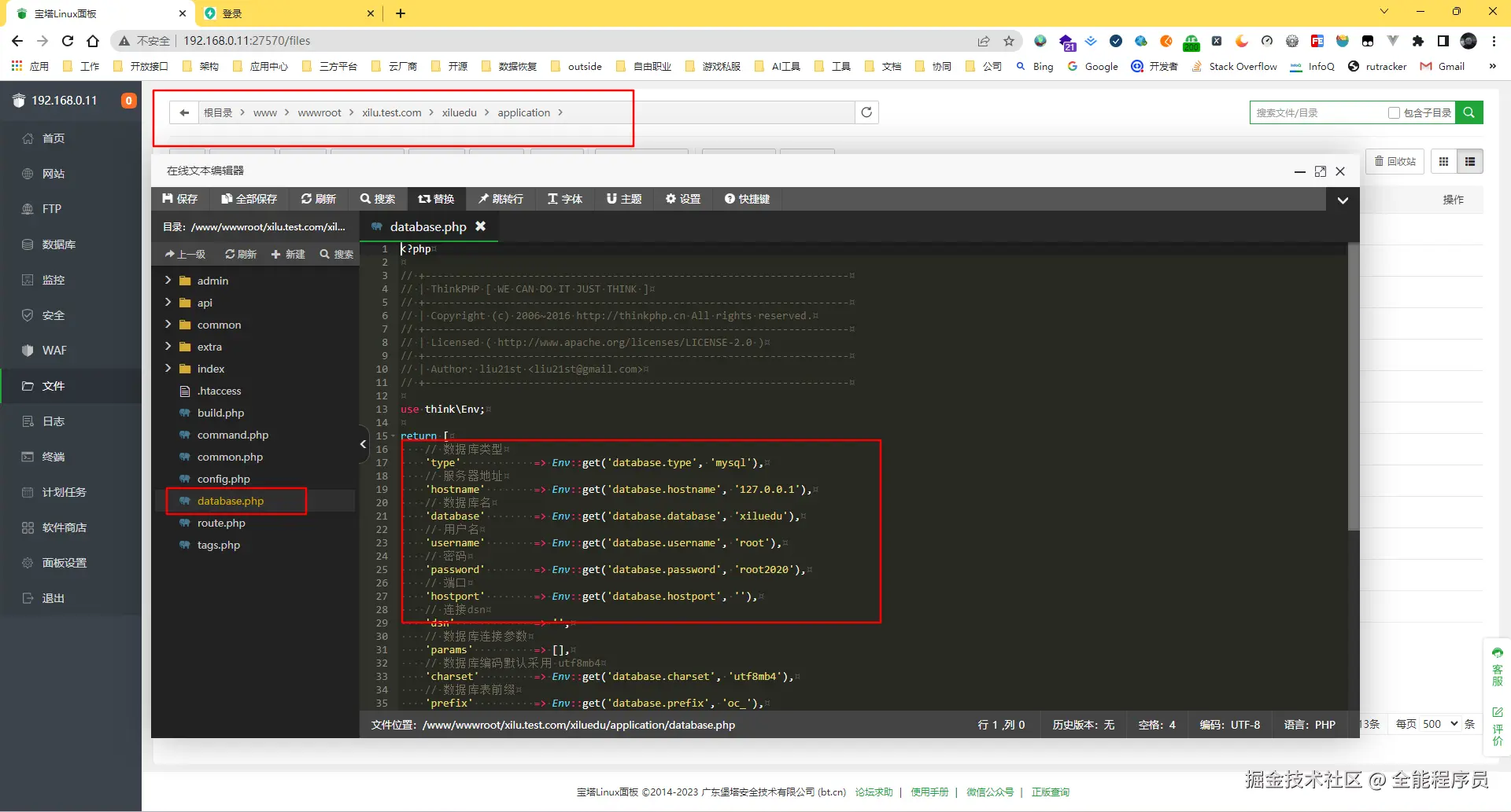 database.php为数据库连接配置文件,该文件地址在application/database.php