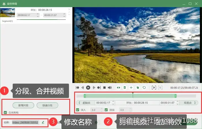 步骤3:录制结束后,我们可以进入 【高级剪辑】 中分段、合并视频,并可对视频进行剪辑、增加特效等后期处理。还可以修改视频名称,更方便您的储存和分享。