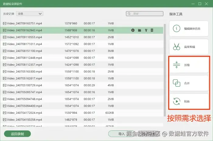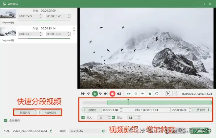 步骤3: 录制完毕后可以对视频进行高级剪辑,如快速分段、增加特效等,还可以把视频进行合并、压缩、转换等。按照个人需求操作就可以了。