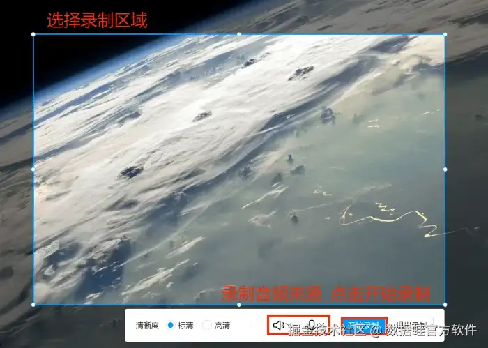 步骤2: 按照个人需求框选录制的区域,选择音频来源 (扬声器、麦克风) 就可以点击 “开始录制” 按钮进行录制了。