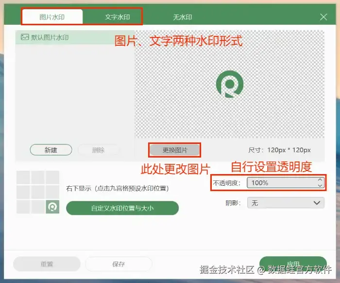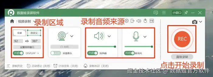 步骤2: 可以按照需求选择录制的区域、设置音频来源,还可以在下方录制水印中设置自己的专属水印哦!设置完毕后就可以点击 “REC” 开始录制了。