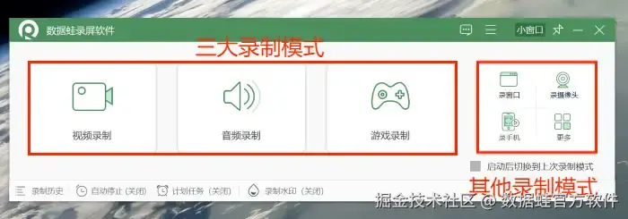 步骤1: 打开数据 蛙录屏软件后,你就会看到该录屏软件的多种录制模式,只需要根据自己的需求选择就可以了。本文以 “视频录制” 为例。