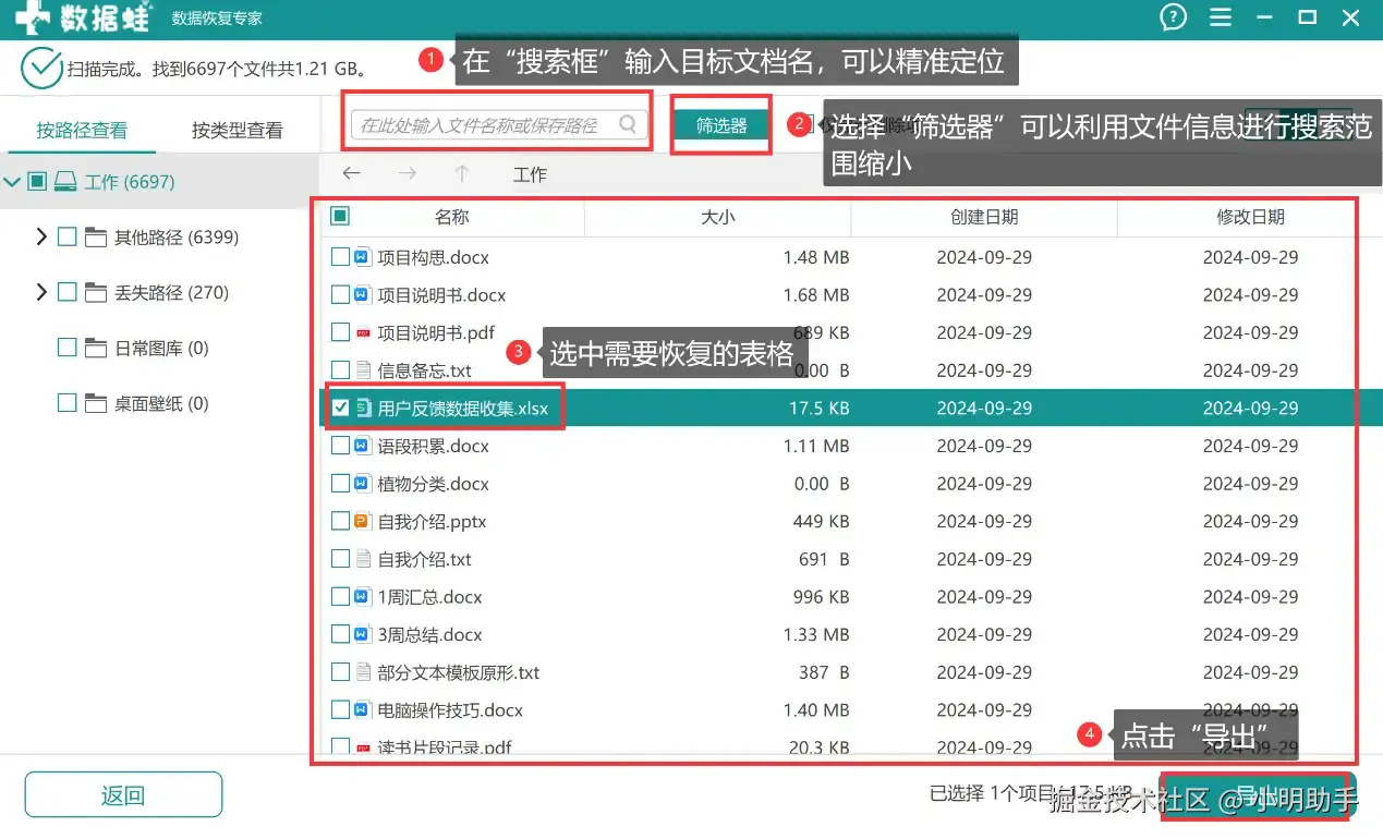 步骤2: 等待软件扫描完成,可以在页面右边选择自己需要恢复的表格文档,建议用户借助“搜索框”、“筛选器”等工具来寻找目标文档。选中需要恢复的表格文件后,点击“导出”。