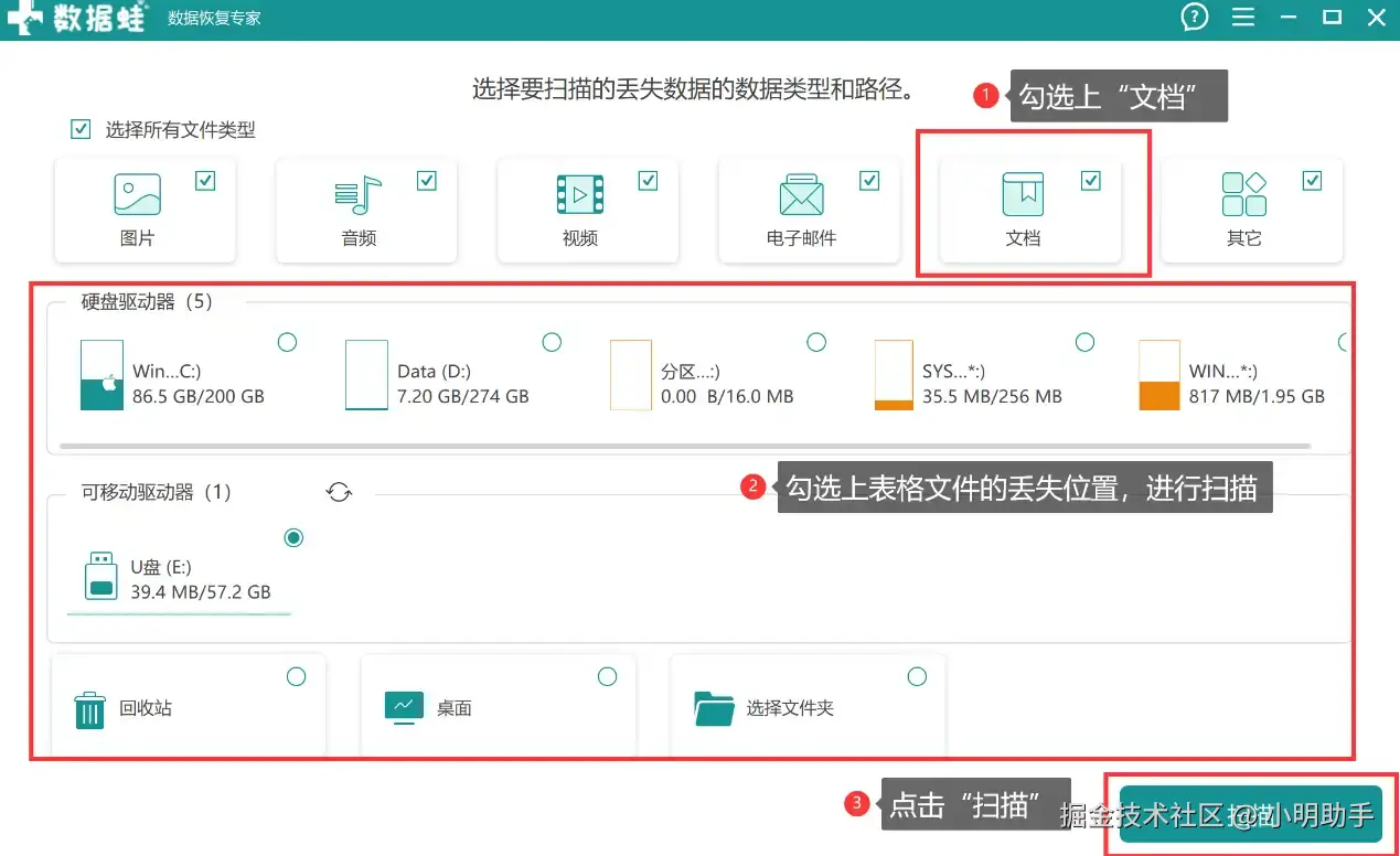 步骤1: 打开这款软件,进入扫描主页面后在上方选择“文档”,再选择电脑表格文件丢失的位置即软件扫描的位置,最后才点“扫描”。