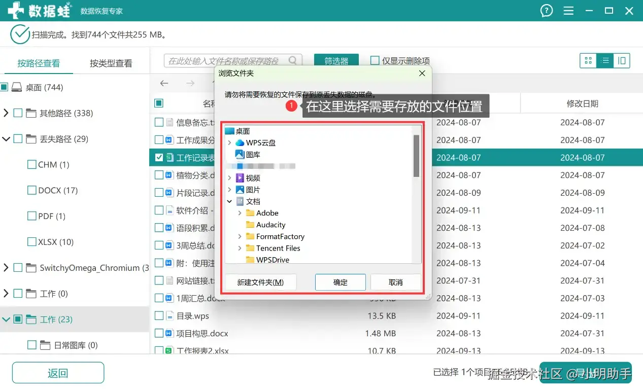 步骤3: 在弹窗里选择恢复表格文件的存储位置,切记不要放回丢失的原位置。
