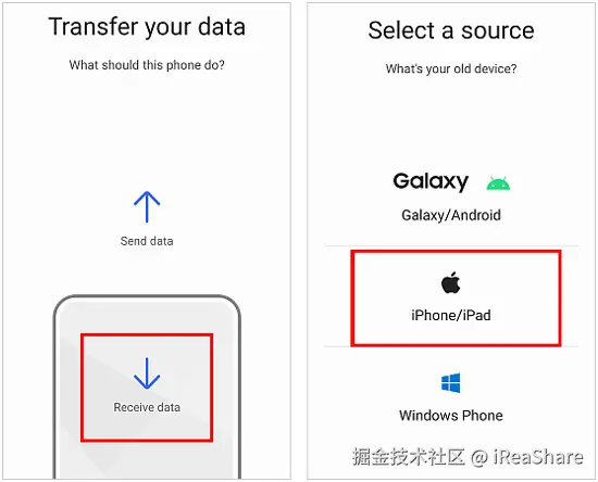 步骤 2: 在 Samsung 上,单击“接收数据”>“ iPhone/iPad ”>“电缆”。然后在 iOS 设备上选择“发送数据”>“电缆”。