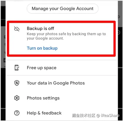 步骤2: 单击您的个人资料图标,然后选择“ Google 相册设置”>“备份”。然后启用备份功能。您的照片将从 iPhone 同步到 Google 相册。