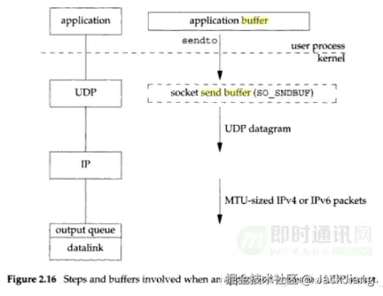 UDP 中的 send buffer 是用虚线框圈起来的,具体的叙述我直接引用书中原文: