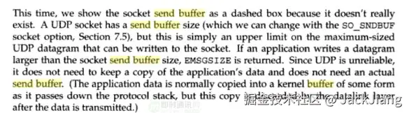 那这是否意味着 UDP 是有发送缓冲区的吗?我们再看一下《UNIX Network Programming》书中所述,这本书的作者权威性我就不多说了吧,在国内高校此书都是当做教材使用的。(