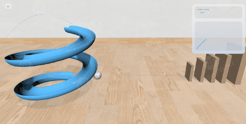 在上图中,小球的落地动画效果已实现,但动画看起来仍显得有些生硬。这是因为在现实中,小球落地是加速运动的,并且当小球接触地面后,受力变化会导致回弹。因此,我们还需要在动画中控制小球的速度和运动趋势,以便更真实地模拟这一过程。