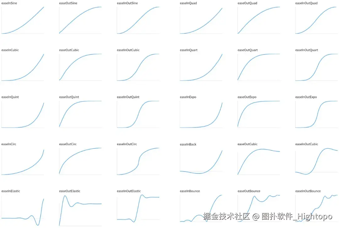 大家也可以该通过链接进行操作感受,通过切换不同的 easing 函数将呈现出不一样的动画效果:hightopo.com/demo/easing… 。