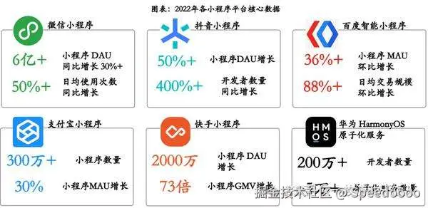 2022年小程序平台数据亮眼。据阿拉丁,2022年微信小程序、抖音小程序、快手小程序DAU分别同比增长30%、50%、30%;百度小程序和支付宝小程序MAU分别同比增加36%、30%;华为HarmonyOS原子化服务数量超过5万。