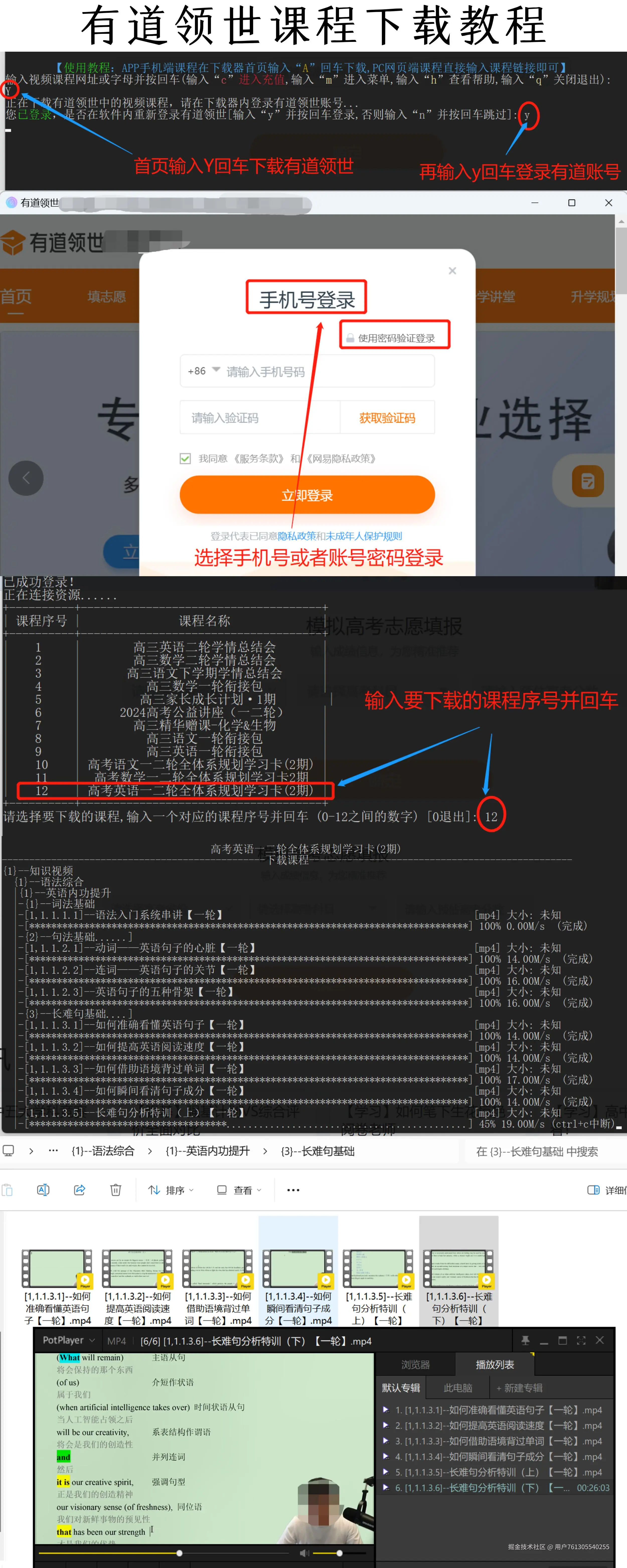 2. 有道领世课程下载教程:下载器首页输入Y回车下载有道领世,再登录有道账号,选择对应课程,即可下载