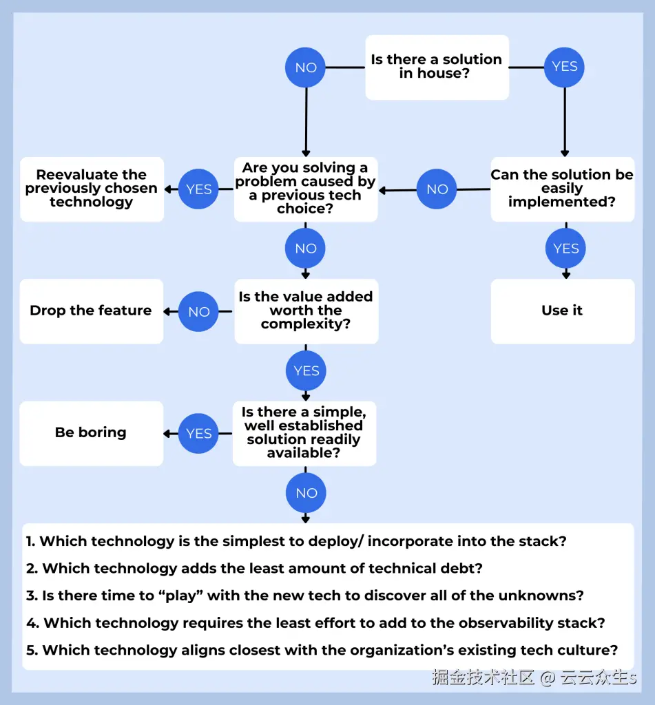 确保您考虑将新的技术选择引入您的堆栈所带来的额外成本(时间、资源、认知负荷)。将所有受影响的团队纳入任何讨论,以充分了解这些选择的成果,并考虑长期支持将是什么样子。