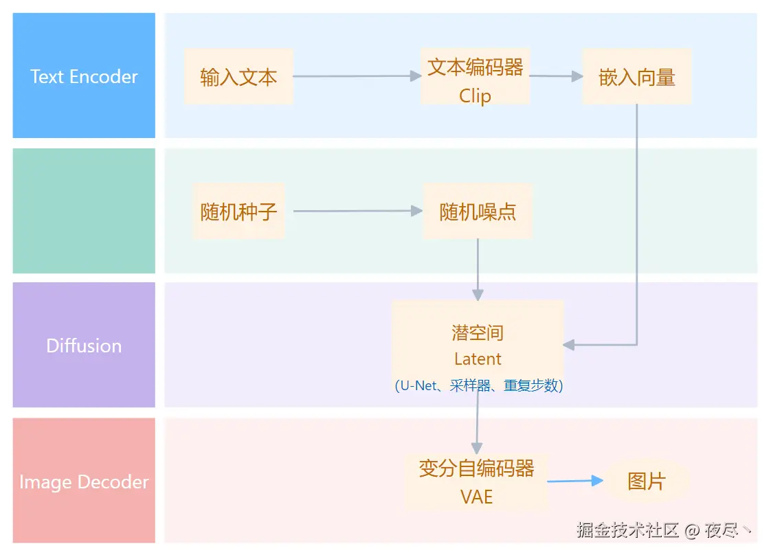 把提示词和种子传给模型,经过降噪和扩散,最后 VAE 修复,图片生成。