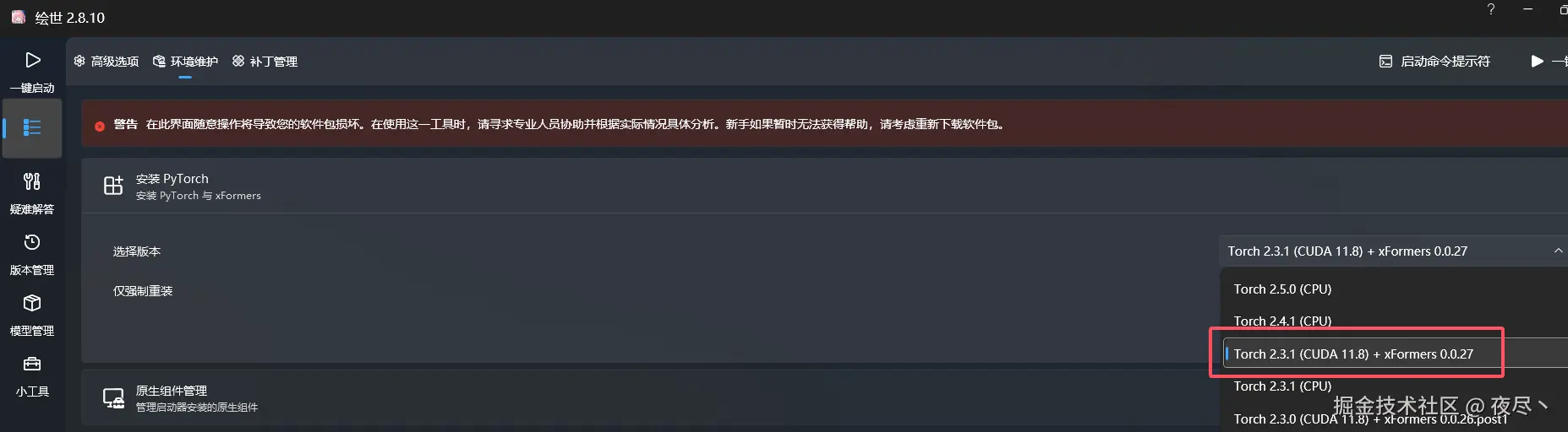 这里选秋叶的绘世整合包,解压后打开,高级选项-环境维护-安装 PyTorch——这是 Python 的一个深度学习框架,选择一个版本,然后安装。