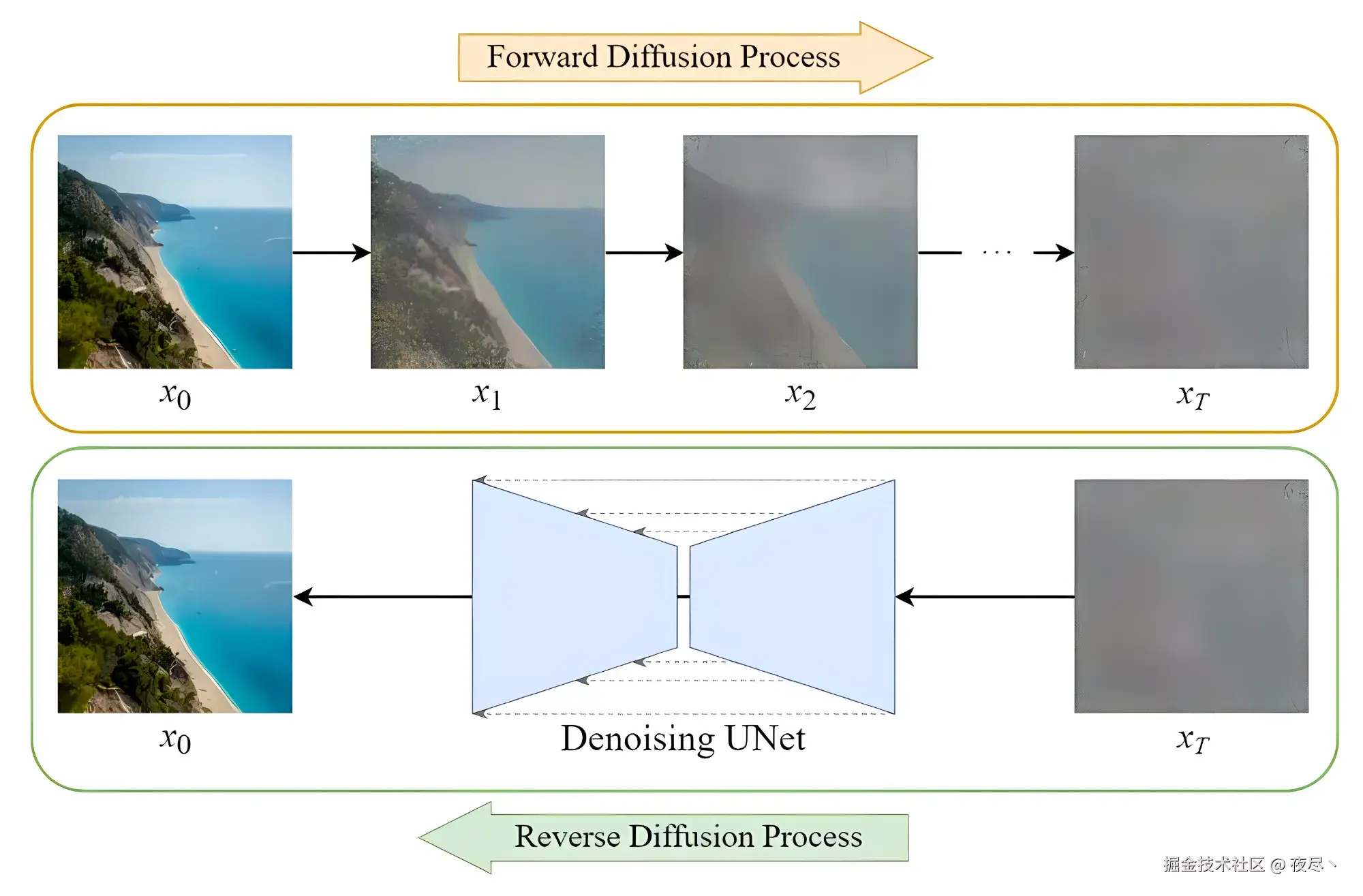 这个是当下 AI 绘画的核心技术,简单来说,先通过对照片添加噪声,然后在这个过程中学习到当前图片的各种特征。之后再随机生成一个服从高斯分布的噪声图片,然后一步一步的减少噪声直到生成预期图片。