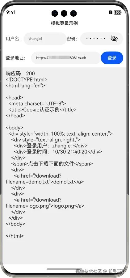 输入要登录的网址和用户名、密码,然后单击“登录”按钮进行登录,应用会发起HTTP请求并返回响应内容,如图所示: