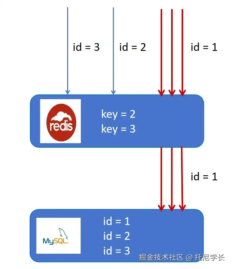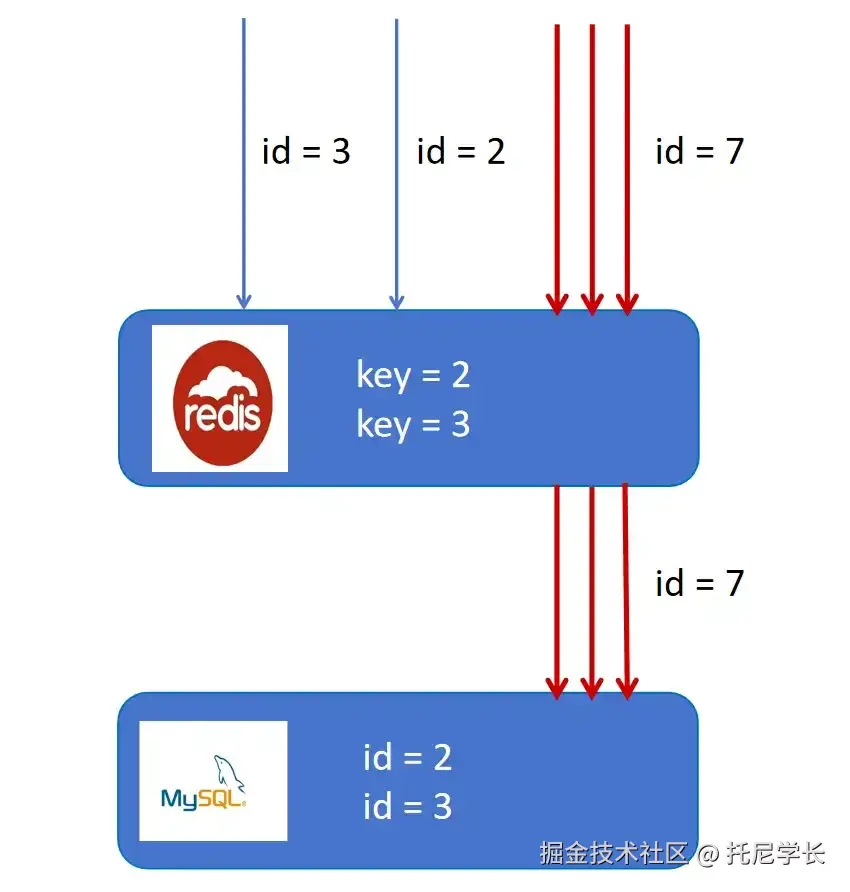 我们可以通过 Redis 实现一个布隆过滤器,将 MySQL 中所有记录的 key 存储在布隆过滤器中,在请求访问 MySQL 前先通过布隆过滤器判定其是否存在,判定为不存在的请求直接丢弃,判定存在的请求再访问 MySQL 进行查询,从而避免了对 MySQL 的查询压力。